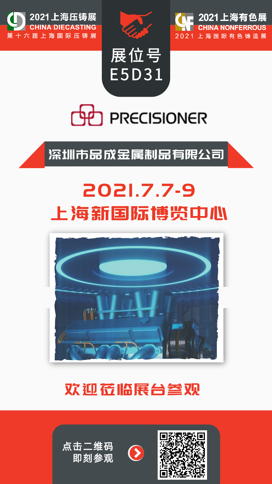 品成金屬將于2021年7月7日-9日參加第十六屆上海國際壓鑄展&2021上海國際有色鑄造展,展位號為E5D31。該展會將全方位展示壓鑄及有色鑄造全產(chǎn)業(yè)鏈解決方案,促進(jìn)企業(yè)相互學(xué)習(xí)、交流碰撞和集智發(fā)展,引領(lǐng)行業(yè)未來發(fā)展新趨勢。現(xiàn)誠邀各位行業(yè)人士蒞臨我們的展位參觀,品成全體員工恭候您的到來,一起攜手挑戰(zhàn),共創(chuàng)未來!