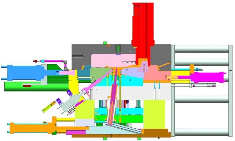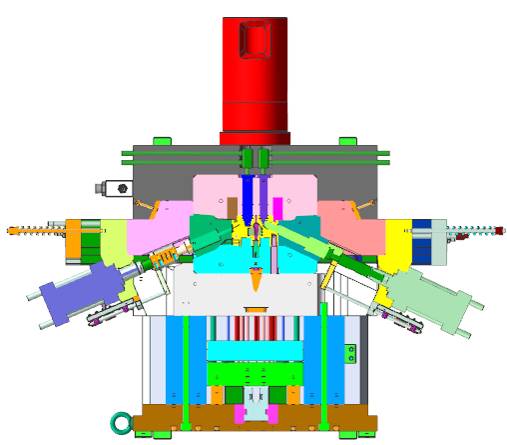 動模部分的行位內有較斜度孔位成型,這樣的大角度使得如何設計固定行位使行位鑲針不退位,使行位穩定運行尤為重要,如圖所示,此項目我們采用液壓+機械行位,依靠機械力固定行位結構,經測試驗證,